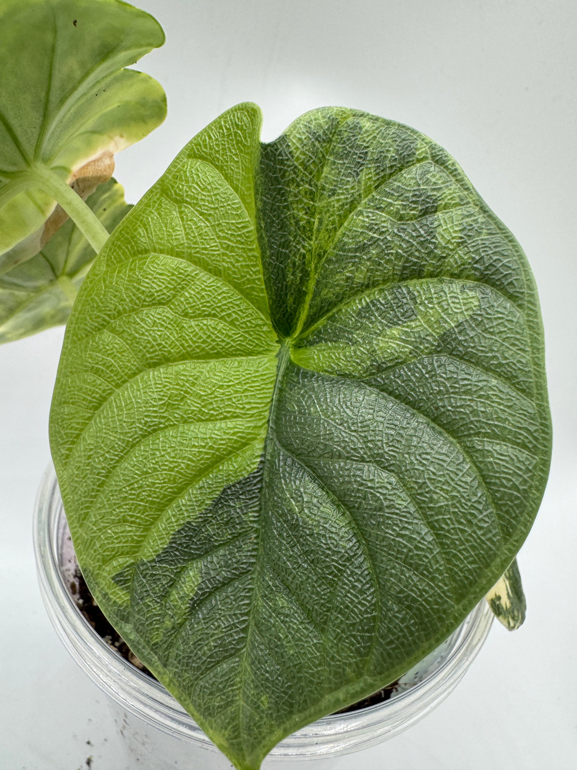 Die Alocasia melo aurea variegata ist eine seltene und außergewöhnliche Varietät der Alocasia melo. Ihre kräftigen, strukturierten Blätter mit lederartiger Oberfläche werden durch leuchtend gelb-goldene Panaschierungen veredelt, die jedes Blatt zu einem Unikat machen. Diese seltene Erscheinung macht sie zu einer wahren Sammler-Rarität, die in keiner exklusiven Pflanzensammlung fehlen sollte.